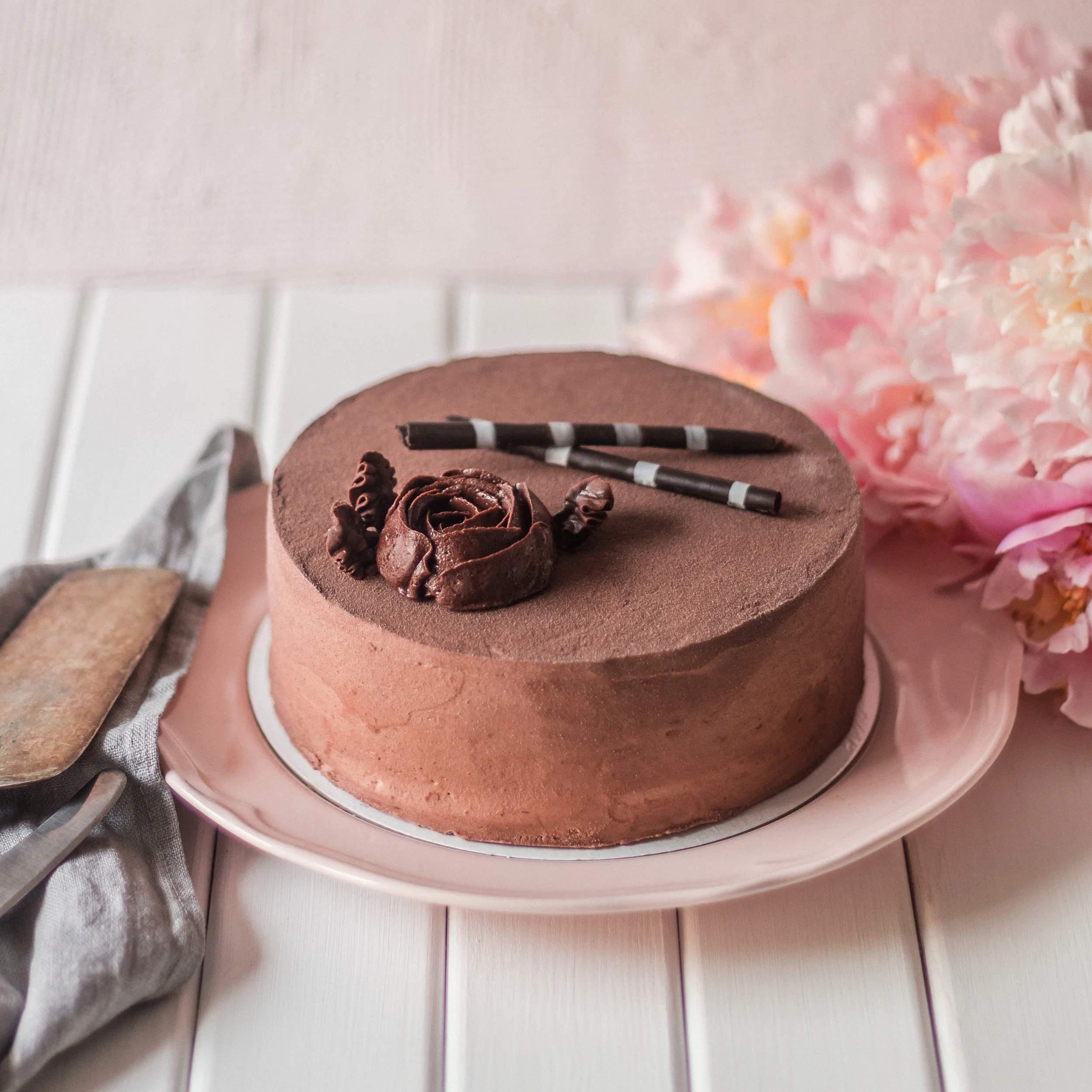 Place your cake on a cake board base that is 2”-4” larger than your cake (leaving 1”-2” around the bottom on all sides). This makes the cake easier to handle, and less likely to be damaged on the sides by the cake box.